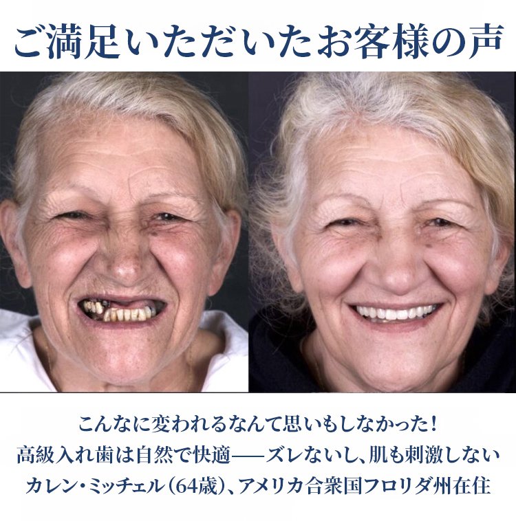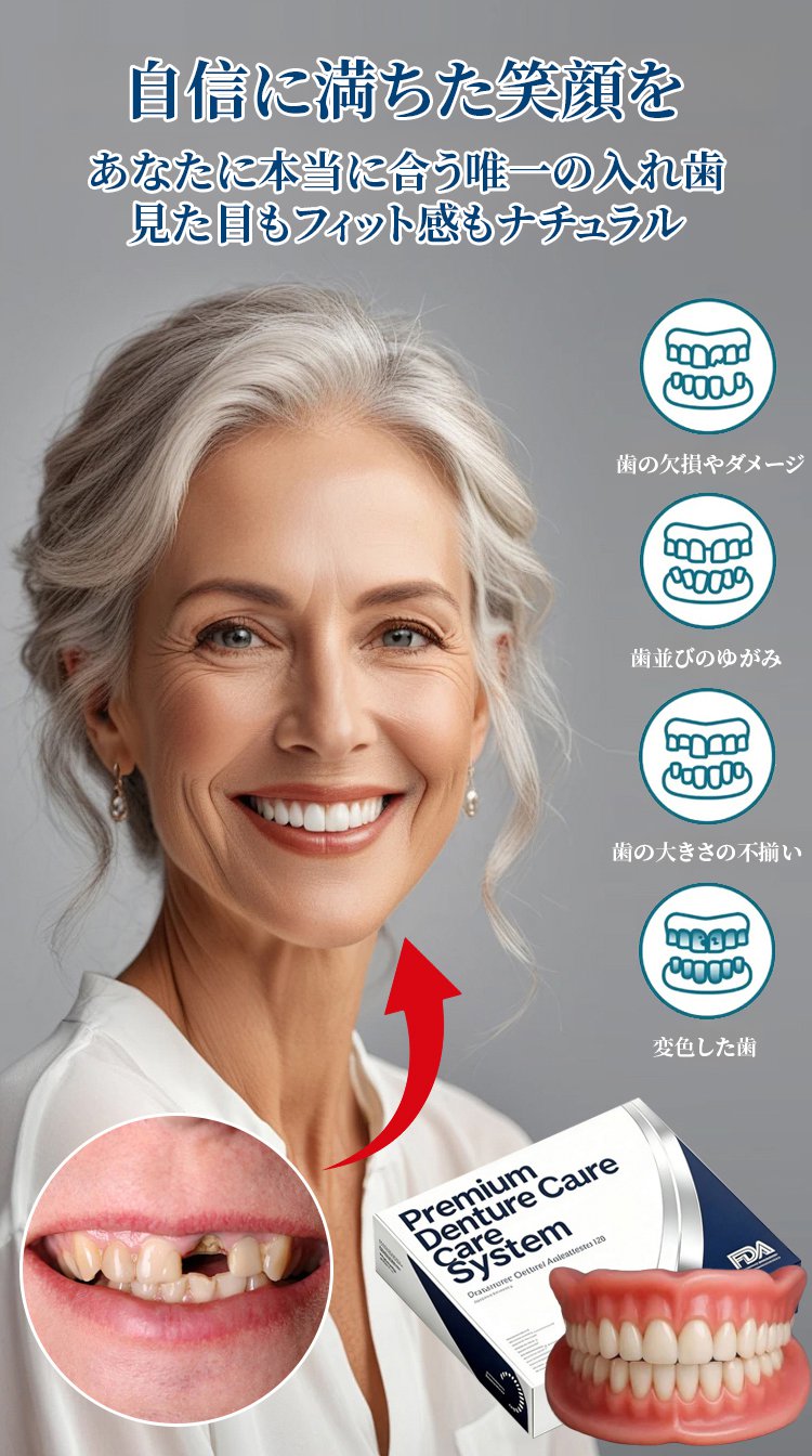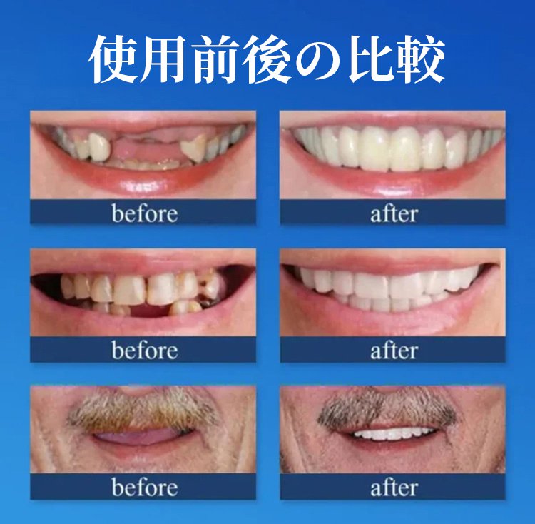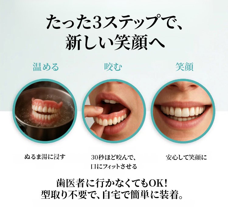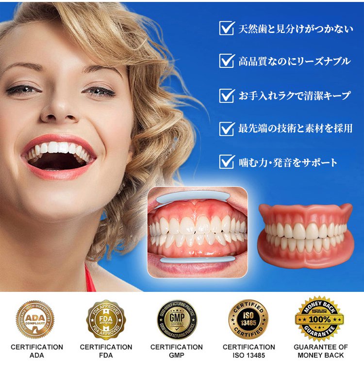 1秒で装着可能。18歳のような健康な歯を取り戻せます。実感できなければ返金、どなたでも使用可能。